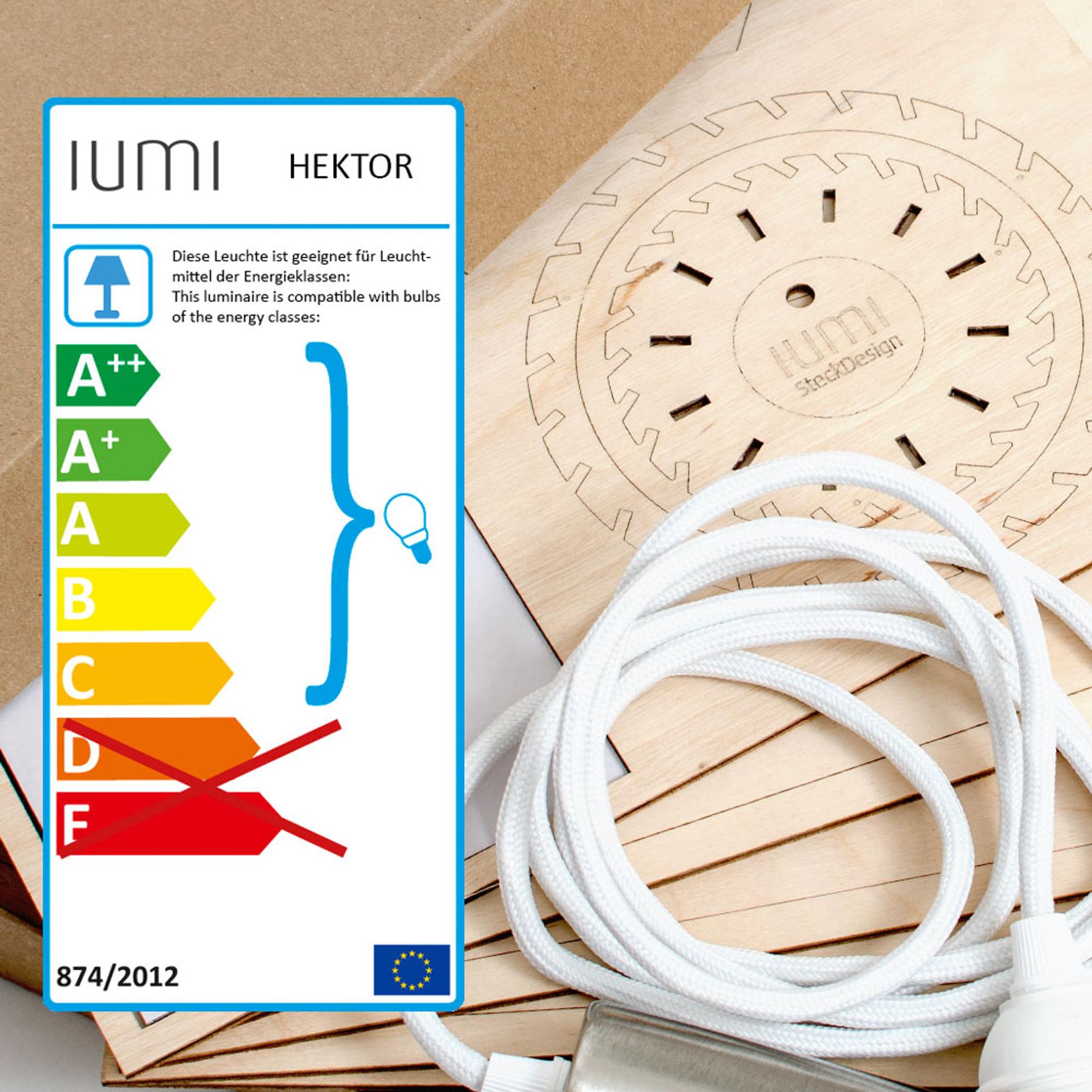 IUMI designt und fertigt all seine Lampen in Deutschland. Die Holzlampe HEKTOR hat raffiniert verdrehte Lamellen und sorgt so für blendfreies Licht. HEKTOR wird mit 2m Textilkabel, E27 Fassung und einem hochwertigen Baldachin versendet.